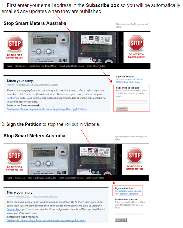 There is also a Facebook site connected to stopsmartmetersau.com If you use Facebook go here https://www.facebook.com/pages/Stop-Smart-Meters-Australia/286633368023567