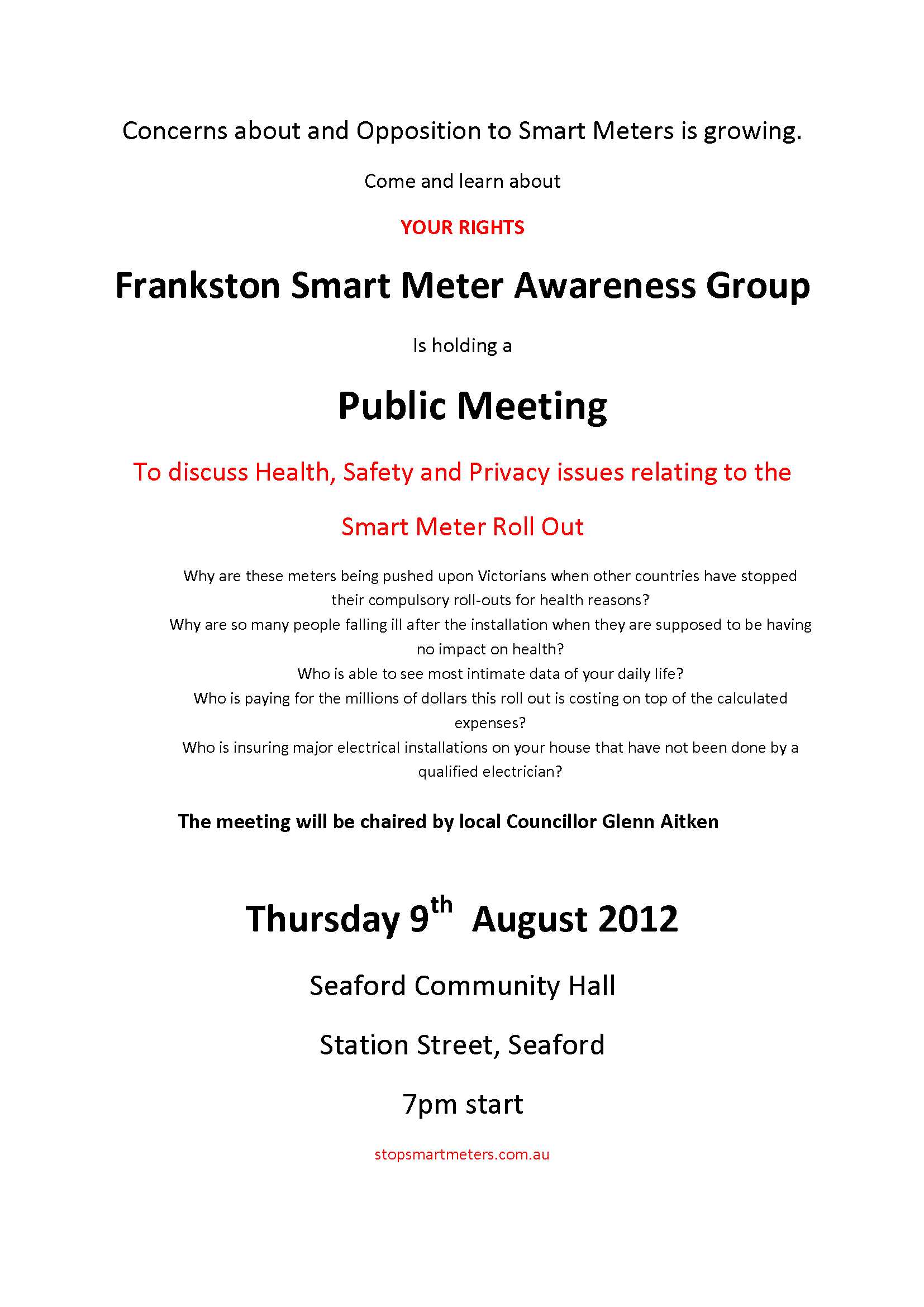 Another Meeting – great we are getting the message across the State. Lock your Boxes, Display your signs. For those who don’t have Computers. Make some signs up for them and take along to the Meetings. Thanks Stop Smart Meters for keeping us in formed of what is going on……Pam. PS check this website daily if you can.