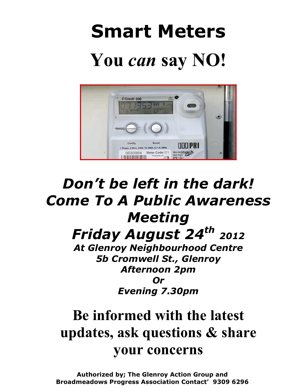 Hope your Meetings are very successful. We are definately getting our message to many many Victorians on the Dangers of SMART METERS to our HEALTH, SAFETY AND PRIVACY. I Look forward to feedback from the Meetings. If you are attending, please help those folk who do not have access to a computer – print out some Posters and Signs for them and take them along to the Meetings…………….Good Luck ….Pam 🙂