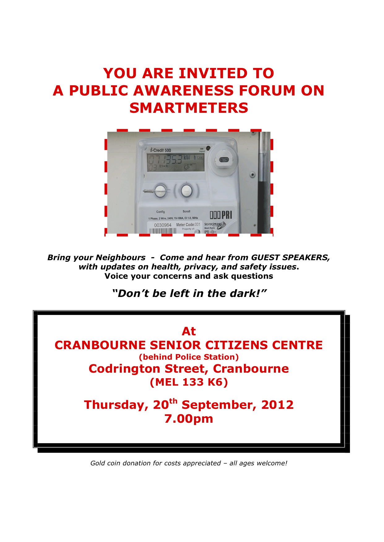 Hope your meeting is a HUGE success! Keep getting the message to all concerned… NO SMART METERS FOR VICTORIA …NO SMART GRID… NO! NO! NO!