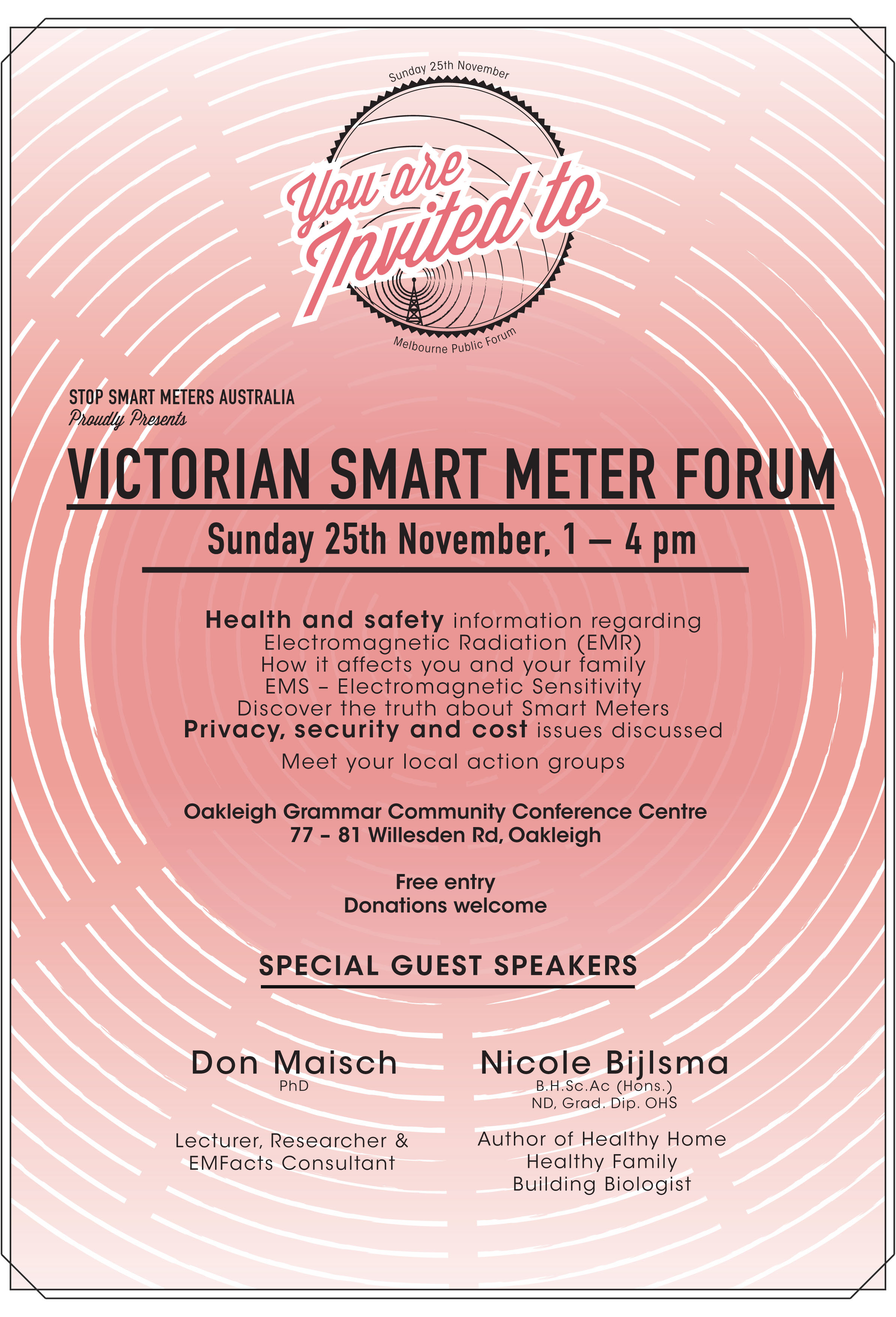 I too attended the excellent Forum held on Sunday at Oakleigh and I would like to congratulate the organisers and all the brilliant information provided to those of us who are against these health damaging ‘smart’ meters.. Each day I’m learning more about our rights and that we don’t have to accept them. I’ve now locked my electricity meter box and will be getting a window cut out so my meter can be read. I’ve also written to United Energy stating I do not want one in the strongest terms. Thank you for all your informative comments – they are very helpful. i found out for sure today that we each own our meter box and it’s ok to have a window cut out.