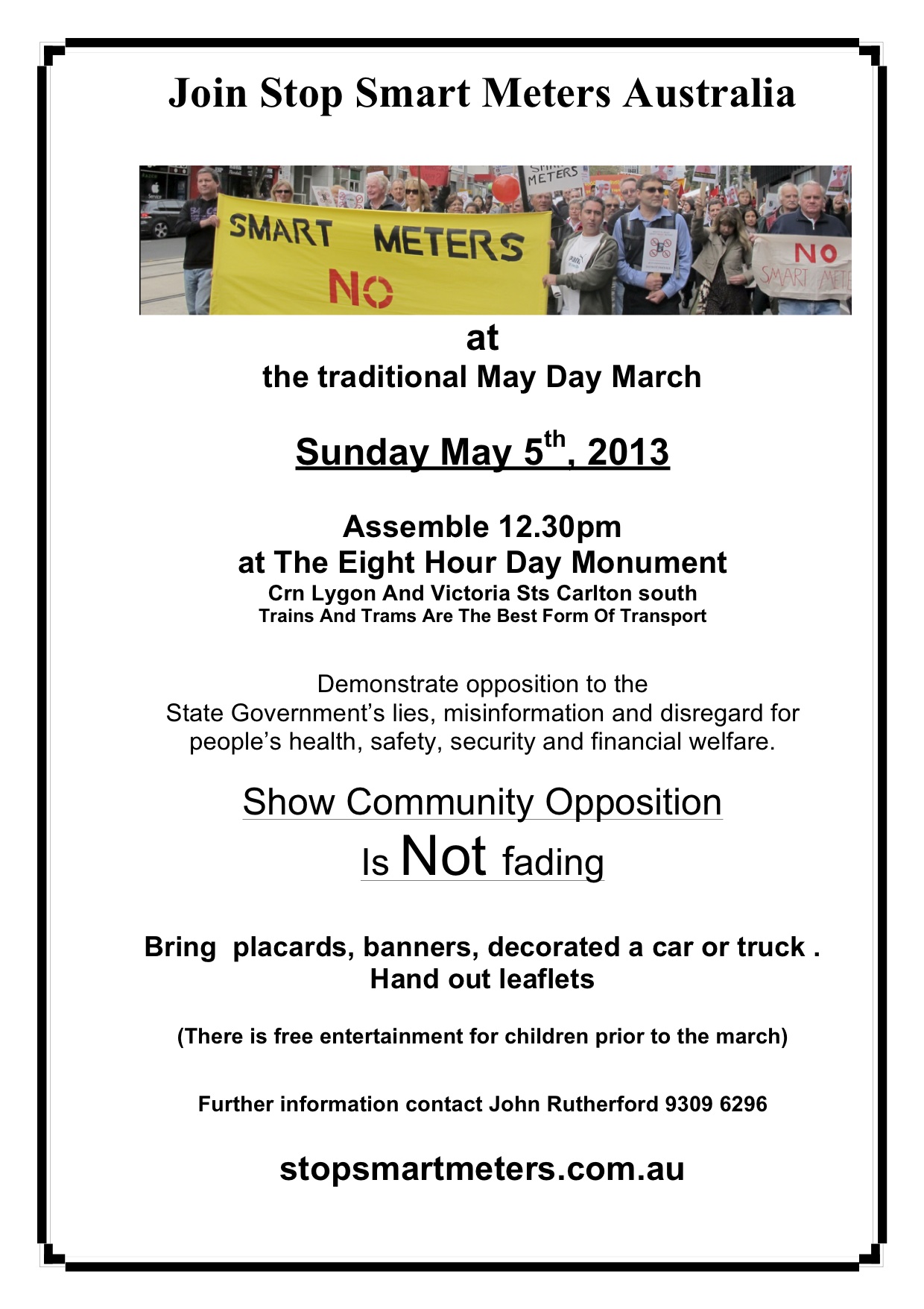 John – Please accept my apologies – I will not be able to attend the March on 5th May 2013. I hope it is a huge success for all of us who are againt the Installation of SMART METERS in our Homes. You and Sonia work so hard for our Cause. We will WIN I have no doubt about it. Good Luck…Pam 🙂