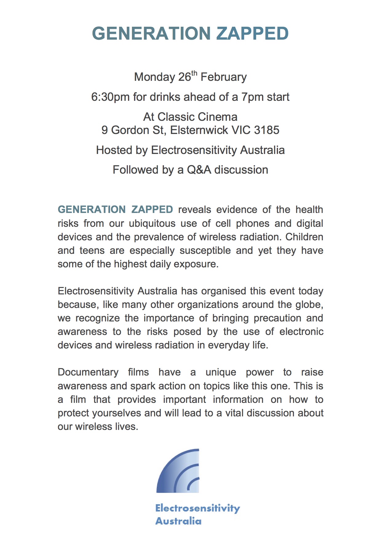 Electrosensitivity Australia is excited to invite you to a special screening of GENERATION ZAPPED, an eye-opening documentary about the true cost of living in the wireless age.